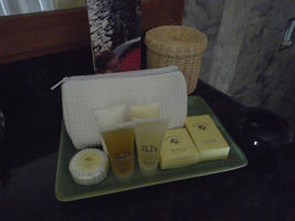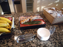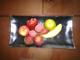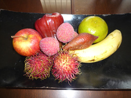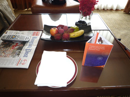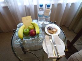 一夜明けてプールでのんびりした後に部屋に戻ると1日遅れでウェルカムフルーツがありました。 |