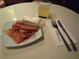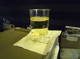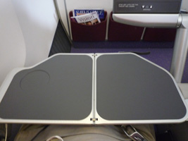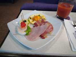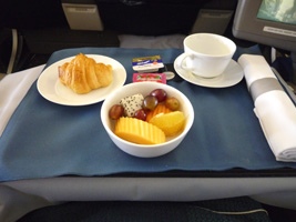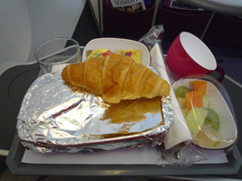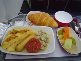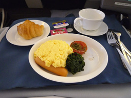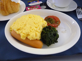 | 短距離なのにミールはホットミールです。ソーセージ付きのオムレツか、オムレツ付きのソーセージからチョイスできます。同じような気がするのだが....。 アームレストから出すトレーはなんかちっちゃい気がするのだが、こんなもの?前回ちょっと感動したちっちゃなトレーで面積を有効に使ったデザインチックな食器のお食事です。なかなか素晴らしいと思うよ。盛りつけ通りに食べようとするとカタカタして落ち着かないのでトレーを90度回転させないと食べられないのとは違う。最近は違うのかな?いや、UAのことだから変っているはずがない。 |