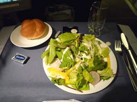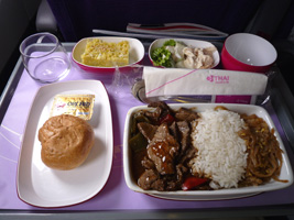 | 15Eという久しぶりのど真中に鎮座して出発です。NRT-BKKは1食ですがBKK-NRTは2食出ます。フライトタイムはBKK-NRTの方が短いんだけど何故か2食出ます。 でだ(c)大熊猫 コンビーフハッシュの上にスクランブルエッグが乗っていたのだが、これ馬鹿うま!昔あったベーコンチャウダーは2番手に落ちました。 到着前の食事は「タイ風牛テンダーロインのグリルサラダ」って奴だったのだが、香菜が多目で中々美味しかったぞ。 |