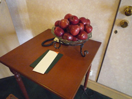 | ウェルカムフルーツがあります。エレベータ脇には林檎が積んであります。 |