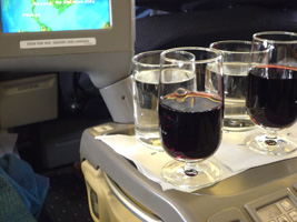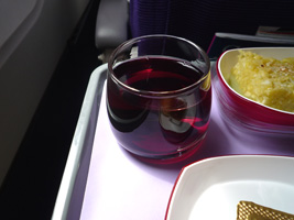 | ミールは牛君か鳥君から選びます。バーベキューの白米乗せ切り干し大根乗せですな。ちょびっとワインも頂いちゃったりして。2時間ほどのフライトでほぼ満席のエコノミーで考えると中々のホスピタリティである。 |