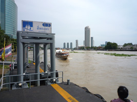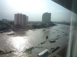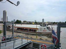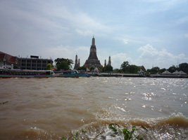 | 午後はお船でぽっぽっぽっぽっぽと川を突き進みバンランプーマーケットとカオサンへ。船上でハプニング。左側に座っていたのだが、右側にセット(特にうねった波)が入りピンポイントで前後左右の4席分に水がどどぉ〜〜ん。カップルがずぶ濡れです。頭から大樽の水を一気にかぶった感じだね。あのチャオプラヤ川の水だぞ....感染症は大丈夫なのか?流石に写真は撮りませんでしたよ。 |
