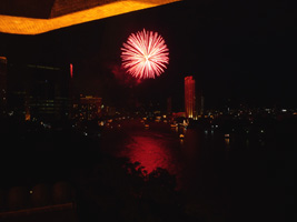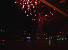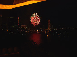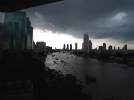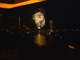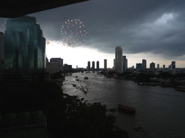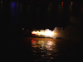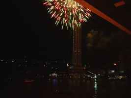 | その後また1時間ほどで今度は機関砲のような爆音が目の前からする。ホテルから100mも離れていないところから花火だ。あの....ホテルにぶつかっているような気がするが....。打ち上げ船を見るとタイ国王生誕80年のイベントらしいが燃えすぎて字が読めないぞっと。 |