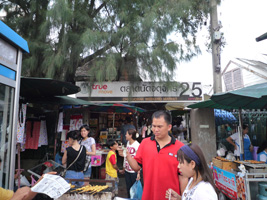 | さてさて、このバンランプーマーケッットは殆どが衣料品ですな。やたら学生服が売ってます。適当に散策していたらなにやら行列ができている。パン屋のようです。どこに行っても美味しいパン屋は一緒だな。 |