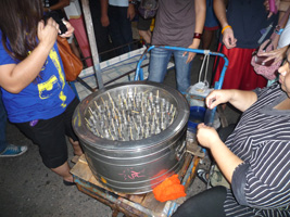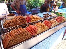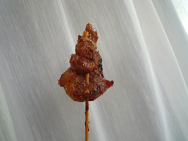 | RiverCity前の露店でお気に入り発見。豚肉の串焼きです。他の何カ所かで食べたのは堅かったり脂が臭かったりだったのですが、ここのは良い感じでサクッとしてます。辛めで食べるのが美味しいです。1本3バーツなのでちょっと高いかな?って気はしますがお試しあれ。ビールも4缶買ったのだが160バーツを請求されたので「今はこれしかないんだよ〜ん」って100バーツ出したら許してくれた。 |