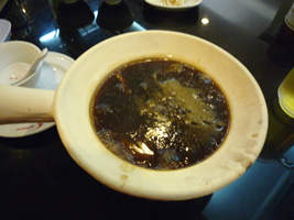 | 席に着くと、なにやら音楽が懐メロで良いじゃないの....。MacBookProをいじりながらビールを飲んでいると「日本の食べ物で美味しいのよ」と餃子を運んできました。「キャンペーンでMYR65リンギットよ」だとさ。餃子は中国のものだぞ。それに高いし....。ビールは4杯目である。旅は飲むに限る。 |