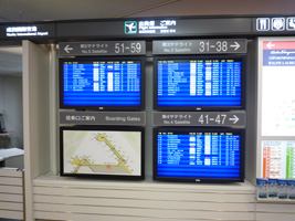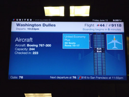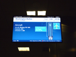 | さてゲートに妙なモニターが増えてます。(写真はLAXのね)今まではカウンター後ろのモニターにアップグレードの状態など映していたのだが、広く見えるように天井からモニターを吊してフライトインフォメーションしています。フライトの機材やシートマップ(実は非常口説明)やアップグレード、ウェイティング情報など盛りだくさんです。これはいいねぇ〜。 |