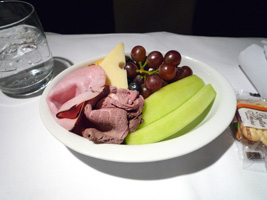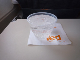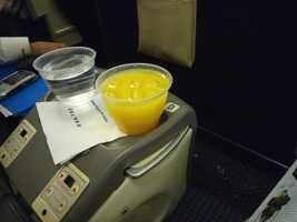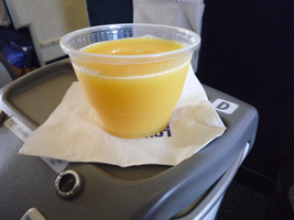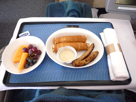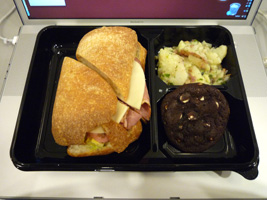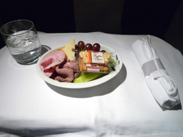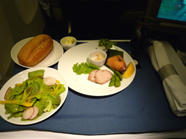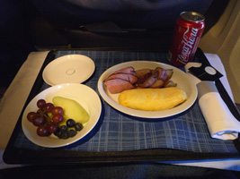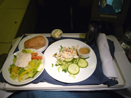 | 同じ機材だと思ったらちょっと違った。もう一本挟まっていたようだ。 7upでディナーです。トレーではなく行きなりディッシュがやってきました。まるで国際線ファーストクラスのようである。 |