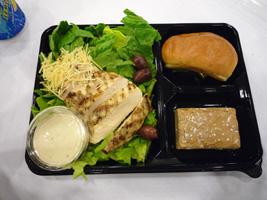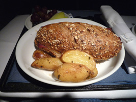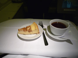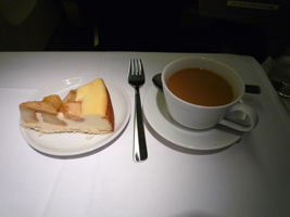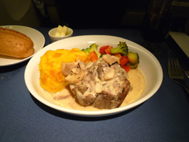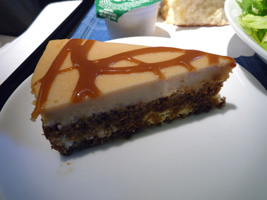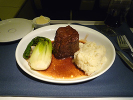 | ミールは....なんか前菜がしょぼくないか?皿で偏ってるぞ。サラダのドレッシングはFAよるとアジアンヴィネグレットとシーザーです。現実にはアジアンヴィネグレットとブルーチーズです。シーザードレッシングが人気ですが、食べてびっくりブルーチーズをチョイスした方達は残していますね。メニューにはロックフォールチーズと書いてあります。 牛肉にしただが、ま、何時もこんな感じでしょう。食後のデザートはアップルチーズケーキに今回は泥水(コーヒー)をお願いしました。やはり泥水でした。 |