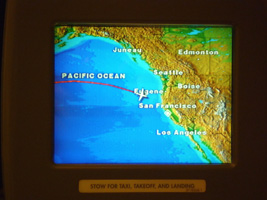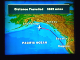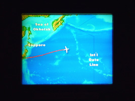 | 今日のフライトはずいぶんとアラスカ寄りを飛ぶようです。食べなかった蟹の分のお食事をしなくては。 |