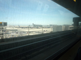 | LAXまでは距離は短いですが利用者は多い路線です。外を見ててロスのダウンタウンの上空を飛ぶんだと妙に感心しながらトマトジュースで到着。到着したのがゲート66だぞ。遠いんだぞっと。 |