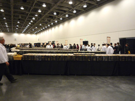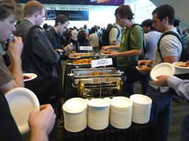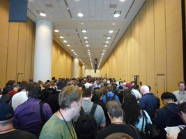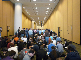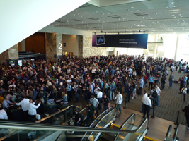| 初日のセッション終了後はレセプションですが、恐ろしく人人人です。一望するとアジア人が増えてますね。iPhoneのこともあるのでWindowsマシンを持った方も増えてますね。文系の方が多いようですね。Windowsマシンで片手にメモで電話してますね。Macの人はMacだけでいいようなので、電話してるか、Macいじってるかですね。メモはMacですればいいだろう。そのためのパソコンだ。ちなみにわたしゃ思いっきり文系である。 |