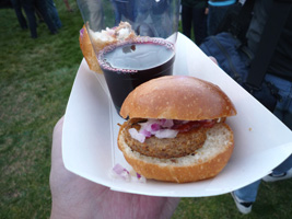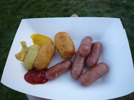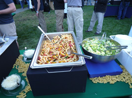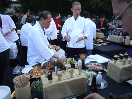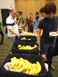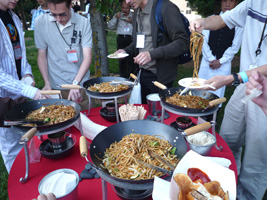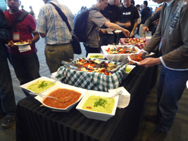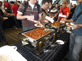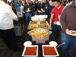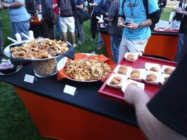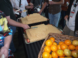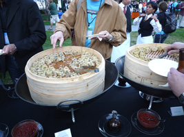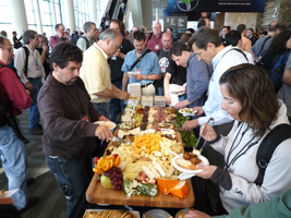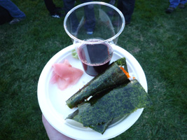四日目。午後は暇なのだが夕方にはWWDC Bash at Yerba Buena Gardens, San Franciscoである。Bashの料理は去年と殆ど同じ。人気は手巻き寿司に集中してますが、去年と違うのは「もっと丁寧に巻けよ」である。相変わらず海鮮卵フェチであるので注文はとびっ子に集中します。料理人(巻き人?)はランダムに巻いて手前のストッカーにぶっさしていくのだが、そんなことを待っていたらアメリカ人や日本人のようにいつまで経ってもありつけないので、こう言うときは日本語の話せる中国人になります。後ろから「とびっ子、とびっ子、もっと、もっと」を連呼します。 |