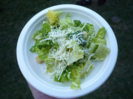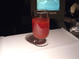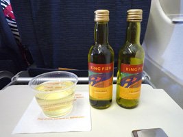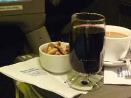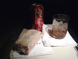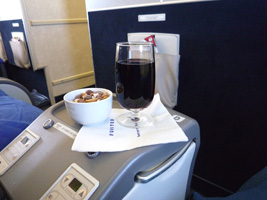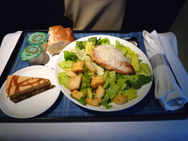 | 機材は行きの757-200と違いA320でございます。お隣は来ませんね。らっき〜♪ファーストクラス全Paxは10人。1Kは一、Premierが一人、SA*Sが一人。流石観光路線である。飲み物サービスにナッツが付いてきますね。ワインと頂きましょう。 ランチ?になるのかなチキンシーザーサラダです。コーラも頂きましょう。 |