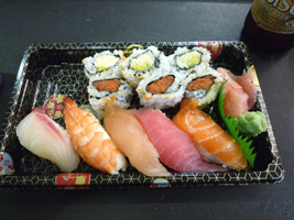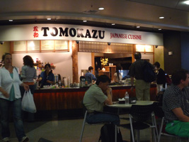 | 最終日のランチ時点では昨日のBashの大量の赤ワインの摂取により食欲は無かったが、ラウンジ近くの「TOMOKAZU」で久し振りにお寿司を食べましょう。味はま、いいとして、ちゃんと握ってるのよ。多分....。ちょっと堅いが1かん150円って感じでしょうかね。食後レッドカーペットクラブへ行き、傷んだセロリをボリボリボリ。 |