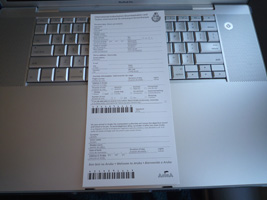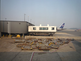 | 空港まではタクシーで行ってto U.S.フライトのターミナルへ。ここでチェックインします。妙に早く行ってしまったのだが、カウンターは2時間半前に空くようです。チェックインの時にUSの税関の書類を頂きます。 ここからの荷物にはプライオリティーはありません。「それは何だ?」ということです。プライオリティタグもどこにも見当りません。 はじめはLASまでのタグが出てきて焦ったがDENまでにして一安心。 |