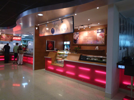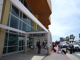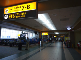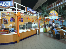 | チェックインしてから一旦外に出て「ALL GATE」に向かいます。入口で「ちゃんとチェックインしたかチェック」があり入ると、まずはセキュリティーがあり、それを抜けるとなかなか小奇麗な空間ですね。免税店もありフードコートもありです。ここで「HAYA SUSHI」というのがあったので人柱のために突入(と、いうか店の人間を捜さないとならない)し、Spicy Tuna Rollを一つお買い上げ。なんと$9.95もします。巻き前(固め前)が8切れ入ってますね。食べるとぉ〜。すごく不味い。まずツナの味がしないことから始まり辛くない。米は大きめの米を緩く炊いた物を無理矢理固めて酢の香りを吹き付け冷蔵庫で固まりましたって感じ。お〜不味い。さぁ、醤油に付けてみましょう。醤油の味が無い...なめると醤油っぽい後味がかすかに残る。初期段階で味は無い。だからぁ〜付けても味がない。試しにガリ(ガリは日本のどこにでもある輸入品と同じ)に醤油を付けてみても味は変らない。ま、カリブ海ですから。 |