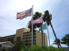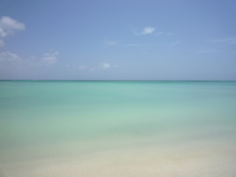 | オーシャンフロントであるからして一面の水平線が広がります。マイアミよりいいかも。もちろんハワイはオアフのワイキキよりいい感じ。なんと言っても静か。波は低いんだねぇ。島の反対側の方がうねりがありそうですな。分っちゃいるが一人で来る所じゃねぇな。 |