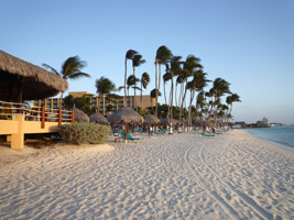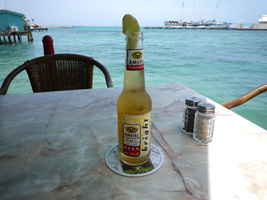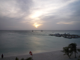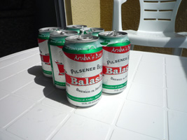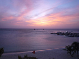 | まずは4500マイル以上、14時間以上の旅だったのでビールでも飲みましょう。ホテルのギフトショップでアルーバのビールを買いましょう。どうして1本買いが出来ないのだろう....。飲んでみると、うん、普通。至って普通。なんだかんだで6時である。太陽は眩しい。7時半を越えたところで一気に夕焼けになり、一気に闇になる。 |