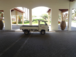 | 暫くしてホテル探検から戻ったところ「部屋が出来たようだから行くぞ」と言うことで「さぁ乗れ」ってこれに?なんでも「Little One」の相性で呼ばれているようです。荷台に荷物を載せ部屋のある端っこのホテル棟へ。 |