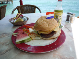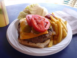 | 何ショットかメモリー保存しているとビートルのストレッチが飾られているカフェ?(食堂?)があったのでちょっとなにかつまみましょう。ちょうど海賊船も見えるしいいでしょう。 いつものことなのだが人通りのないところで最初の客として入るのだが、何時の間にか満席です。どこから沸いてきたんだ?人を呼ぶ性質は変っていないようです。丁度UAが飛んでくる時間ですな。 お勧めだというハンバーガーを頂きました。パイナップルは余計ですが、味は至って普通。周りのアングロサクソンも同じ物を頼んでいる奴が多い。アングロサクソンはおしゃべりですがハンバーガーが来ると無口になります。こちらがちんたら食べている間にあっという間に食べてしまいます。やはり食べ方が巧い。浸透しているとはいえまだまだ日本人にハンバーガーを巧く食べる人種ではありません。やはりハンバーガーが国民食であるアメリカ人は食べるのが巧い。日本人だって米を食べるのは巧いでしょ? |