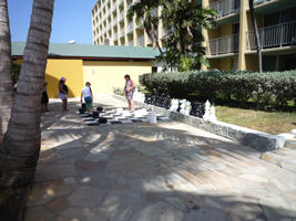| なかなか暖かく、なかなか日差しも強いのだが、なんせ風が強い。東風がかなり強い。プール沿いにはオセロもチェスもあります。 |