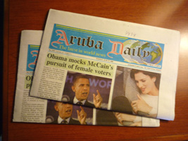 | 地元新聞Aruba Dailyが部屋にやってきました。広告が占める割合が大きい。メールアドレスはyahoo.comです。 |
