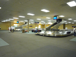 | 免税店やらフードコートを抜けるといきなりターンテーブルです。ここで荷物を一旦ピックアップします。そうです、アメリカに到着したのです。荷物をピックアップして今度は入国審査があります。ここではチェックインの時に配られた税関の書類だけを出します。これを抜けてまずは預け荷物をドロップします。次に待構えていたのがセキュリティーチェックである。さっきのは何だったんだ?これを抜けると本来のゲートがあるターミナルに着くのだな。 |