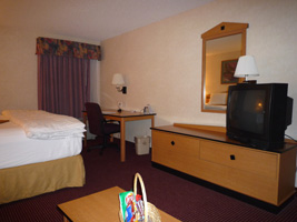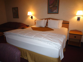 | ホテルに行くのにシャトルバスを待っていると、あまり来ない。ホテルに電話すると乗合だからもうちょっと待っていろと。面倒なのでタクシーで行くことにしたのだが、空港から4マイル程って書いてあるのに、実際は偉く遠い。$22もかかったぞ。空港自体が広すぎじゃ。 |