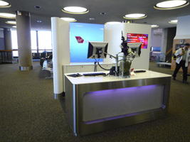 | LAXでまたゲートが遠いと来たもんだ。今度は往路と逆です。ターミナル7からターミナル6へ移動です。UAの隣のVirgin Americaのゲートのカウンターです。かっこ良くないが至って普通に普通と違う造りは出来るのです。 |