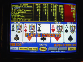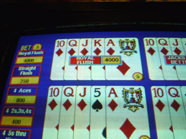 | 取り敢えずビデポーカーでもとやってみると、久しぶりに出たぁ〜。でも一個だけね。一つだとね誰も来てくれないの。普通にCash Outなのよ。何年ぶりでしょう?つぅ〜か他も惜しいよね。これがジャックポットだったらな〜。あとはMGMとPHに遠征して履歴だけを残しておくと。PHはいらないかもしれない。 |