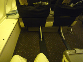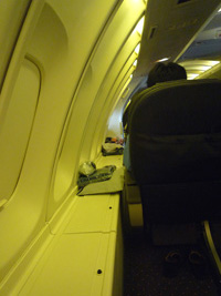 GSMはいません。さっさと搭乗したところで前出の地獄の光景が目の当たりに....。今更どうしようもないのでひたすら寝ることを決意....。最近1Kだからといってミールは先に聞きに来てくれませんが、セカンドチョイスはありません。1K以外にはセカンドチョイスを聞いています。当然こんな場所(この機材のあるコンパートメント)に1Kがいることは珍しいのでみなさんセカンドチョイスを聞かれています。荷物の置場にも困っています。 |