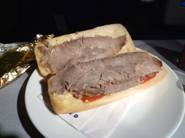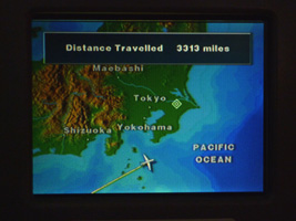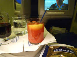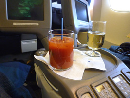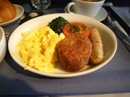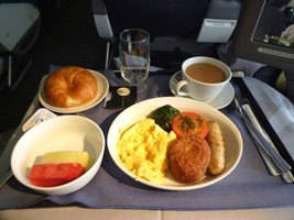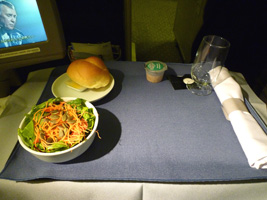 | 運び屋さんとニアミスしつつ登場開始。取り立ててなんの変化もないビジネスクラスのフライトです。ミールは先週のNRT-BKKと同じ。 |