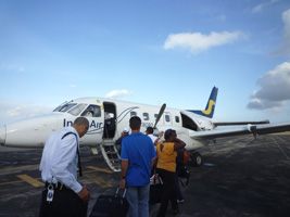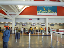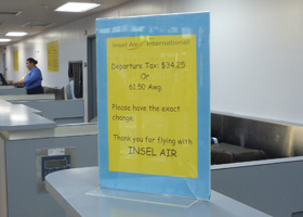 | 今一盛り上がりに欠けたクラサオを後にしセントマーティンへ向かいます。 チェックインで小さなトラブル。「セントマーティンはビザがないと行けないよん」「日本のパスポートだから大丈夫だよん」と、どこかに問い合わせているが、誰も日本のパスポートのことなんかわからない様子。30分ほど色々なところに聞いたようだがやっぱり駄目らしい。そこで「ほら戻りのチケットのあるんだよん」って見せたら、「それなら何とかなるかもしれない」と、またお電話。結局問題ないことが分ったようだが、何時もこんなに面倒なのかな。やっぱりここに来る人でUAを使い人は少ないのから? |