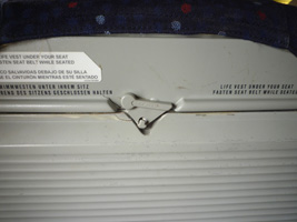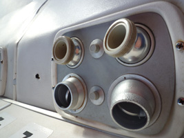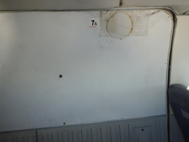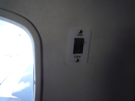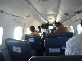 沖止めで〜す。こりゃなんちゅう飛行機だ?Embraer EMB 110 Bandeiranteというらしい。自由席です。17人乗りらしい。笑うぐらいぼろいですな。右側の一番後ろ(離陸時は左側)に乗ったのだが、スイッチがあるのよね。OFFになっていたけど怖いからONに出来なかった。シートの左サイドはカーゴドアです。 |