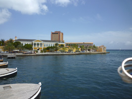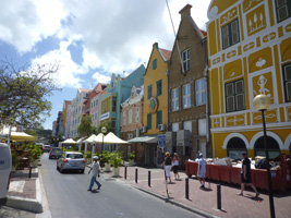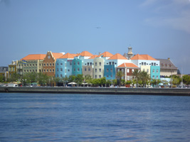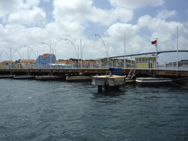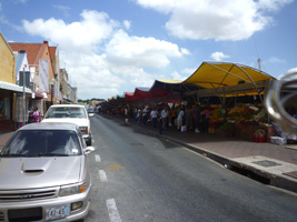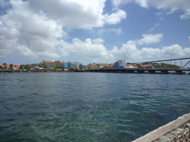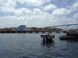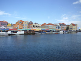 | さてと、街に出てみますかね。フロントで地図を貰い場所を確認してみるとウィレムスタッドのプンダ(Punda)側のようだ。このプンダとオトロバンダ(Otrobanda)が観光名所のエマ橋で繋がっているようだ。ホテルはプンダの先端にあるのですぐにオトロバンダ側が見えます。 なるほど、カラフルな建物が並んでますな。そしてフローティングマーケットへ....ってこれだけですか.....。お隣にあるラウンドマーケットの方が広いぞ。 |