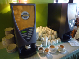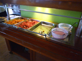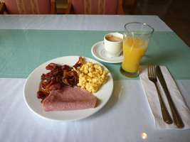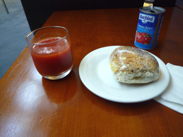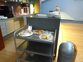 | 一夜明け、今回の宿泊プランは朝食付きWi-Fi付きだったので朝食に行ってみましょう。コンチネンタルタイプですな。うん、やっぱり朝は食えん。 |