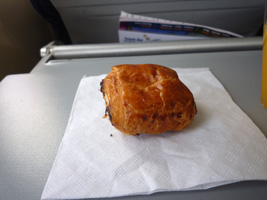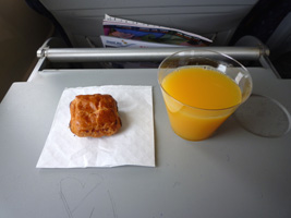 | 機材はMD83だそうです。指定席ですよ。この機材もボロいけど気にしてはいけない。 離陸直後にPAXのボーディングパスを集めます。抽選で一名に「何かが」当ります。ドリンクサービス後にボーディングパスを返してくれるのだが、これが時間かかるかかる。 ミールもあります。手渡しミールです。チョコレートデニッシュ。うまうま。ソフトドリンクの一番人気はクランベリージュースでしたな。 |