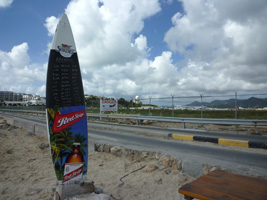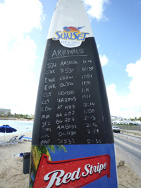 | Sonesta(今回宿泊のホテルね)のマホビーチを挟んだ反対側にあるカフェには到着時間が書いてあるサーフボードが刺さってます。出発時間は書いてないな。このマホビーチは狭い浜があって海に向かって急激にスロープになっているのでジェットエンジンの暴風によって一歩間違えると海側に転げ落ちるので注意が必要です。 |