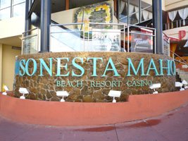 | まずは探検に出かけましょう。ホテルを出て1分ほど歩くとMAHO Beachです。こりゃ近いわ。まさに滑走路の端に柵があり、5mくらいの幅の一般道を挟みビーチがある。こりゃ凄そうだ。 近くにはスーパーもあるし、レストランもそこそこ揃っているし、大きめのカジノもある。一人だからしてレストランで食事なんかしないでスーパーで買ったビールとおつまみで十分に暮らせる大熊猫です。 |