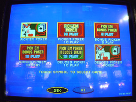 | ラスベガスのストリップからは完全に消えたビデオポーカーのPick'emですが、マルチプレー・マルチデノミのPick'emがあったりします。「Pick'em 10 Play」「Pick'em Bonus 10 Play」「Pick'em Deudes Eild 10 Play」で¢20/$1デノミなんてあったりする。その他にも面白そうなマシンもある。古いわけではなく最新のペニースロットもあったりするんだな。たまにはコンプを気にしないでこう言うところで遊ぶのも良いぞ。 |