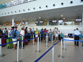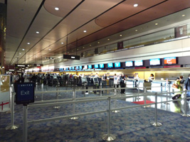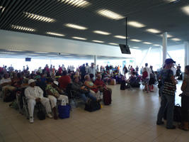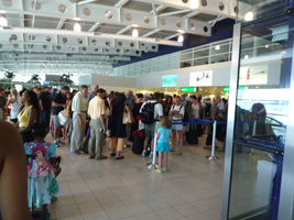 | チェックインを終え、パスポートコントロールの前でまずはボーディングパスとパスポートのチェック。ちゃんとブースになっているので多少お時間がかかります。問題はこの次。セキュリティの前に出国審査があるのだが、ここが大混雑。まるで小振りなシカゴの入国審査のようだぞ。現地人の割り込みも少なからずある。白人系はこう言うのは通さないね。特に混んでるしね。割り込んでも係員にとっ捕まって後ろに並ばされるが懲りないねぇ〜人間が駄目なんだろうね〜。 出国審査はなんと50分です。もう時間がありませ〜んって感じ。 |