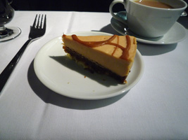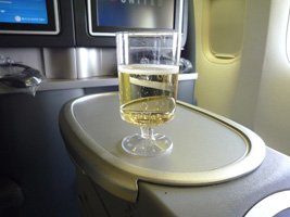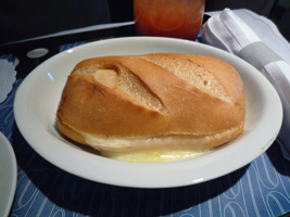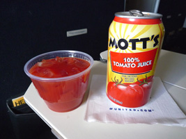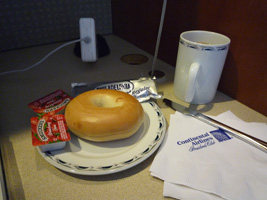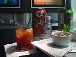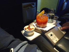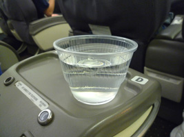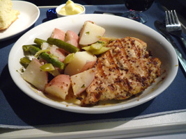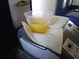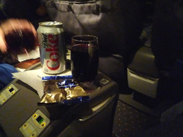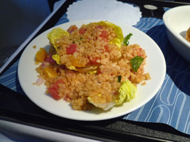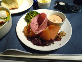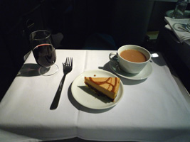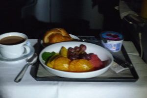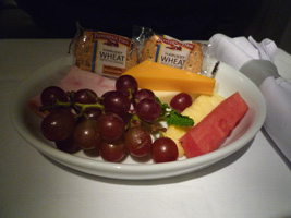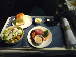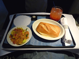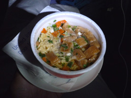 | たまにはフライトの半ばでなんか食ってみましょう。この撮影も苦労したのよ。なんせ真っ暗なんだから。シートを倒して、後ろべったりで座って、手の平に皿を持って、読書灯を当ててパチリ。 |
