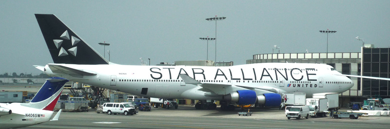 | ということで、結構距離のあるターミナル7まで戻ります。と、久しぶりにターミナル8まで行ってみるかと歩いていると、ゲート70番辺りにStar Alliance塗装の744が停まっているではないか。Star Alliance塗装の744なんてUAにあったっけ?もしかして今日はこれか?折角だから写真を....。でもStar Alliance塗装だからと言ったって中身は普通なんだよな。 |