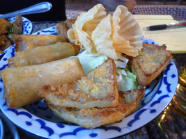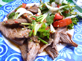 | カオサンで衣料品関係を見た後はまたビールっしょ。このヤム・ヌアも辛いながら美味しい。ちょっと雨が降ってきたので奥へ移動しましょう。 |