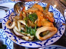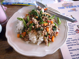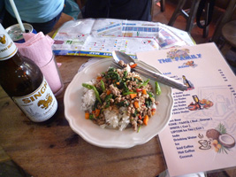 | 500GBから外付け320GBへと変貌を遂げたMacBookPro(Early2008)2.6GHzでなんと一仕事をこなし、またまたチャトゥチャックへ。 まずはビールっしょ...。こりゃまたニンニクが効いていて美味しいカオパットムー(だっけな?)。 |