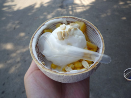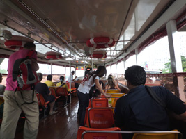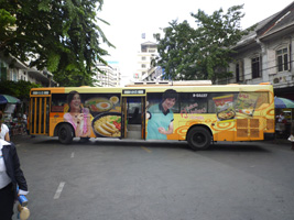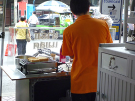 | チャイナタウンで途中下船。このピアで降りたのは実は初めてなんだがピア前の広場(道?)で道幅とほぼ同じ長さのバスが転回している。何度も何度も切り返しているバスを横目にまずはうまうまおやつを頂きましょう。なんてことはないトーストにバター塗って甘いミルクをかけたもの。これが馬鹿甘。 チャイナタウンではパッケージ用の商材を買ってさっさと後にしてカオサンヘ向かいましょう。 |