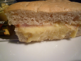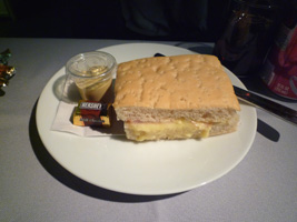| ご到着の前に スモークターキー、チェダーチーズ、マヨネーズのフォカッチャサンドイッチ マスタードマヨネーズ |