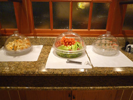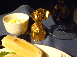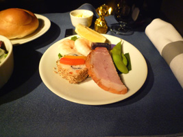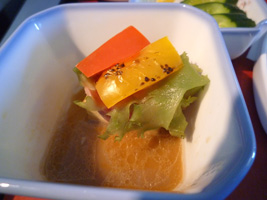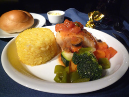 | はじめに ・レモン風味の海老、メープルグレーズのベークドハム 野菜巻き寿司、甘酢生姜(ガリと言えガリと) ・季節の葉野菜 葉蘇ヴィネグレット メインコース ・白身魚のソテー、オリーブ入りトマトレモンケッパーソース 野菜の取り合わせ、サフランライス デザート |
