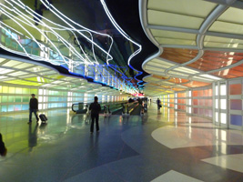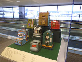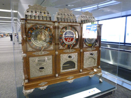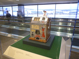 | 夜明けフライトでSFOに到着。SFOミュージアムは古きスロットマシーンですな。なかなかお洒落なデザインがあってよろしい。どうせ国際線ターミナルのRCCは空いていないのでちんたら鑑賞しましょうね。 |